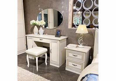 Чтобы не загромождать пространство спальни, некоторые решают приобрести столики туалетные без зеркала. Вариант осуществляется без весомых потерь, если в комнате имеется шкаф, оснащенный ростовым зеркалом. Решение смотрится оригинально и удобнее в плане свободного места на поверхности стола. Также к данному варианту обращаются, если зеркало уже имеется и расставаться с ним не хочется.
