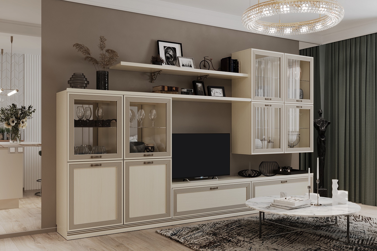 Модульная система позволит регулярно менять внешний вид гостиной по своему усмотрению. В комплект входит два навесных шкафа-витрины, напольные шкафы с застекленными вставками и глухими нижними фасадами, настенные полки и вместительная ТВ-тумба.
