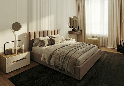 Мягкое, вертикально оформленное изголовье, выглядит современно и элегантно, визуально вытягивает пространство и делает интерьер более гармоничным. Обивка из велюра в универсальном оттенке легко вписывается в любой стиль — от минимализма и скандинавского до современного и неоклассики.