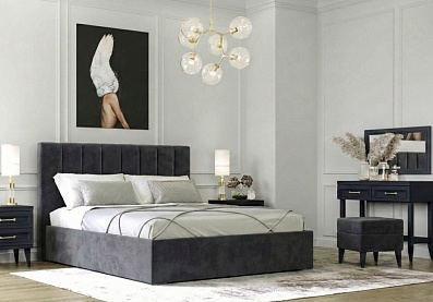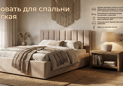 Мягкое, вертикально оформленное изголовье, выглядит современно и элегантно, визуально вытягивает пространство и делает интерьер более гармоничным. Обивка из велюра в универсальном оттенке легко вписывается в любой стиль — от минимализма и скандинавского до современного и неоклассики.